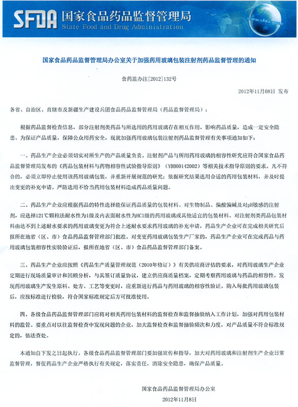 國(guó)家食品藥品監(jiān)督管理局辦公室關(guān)于加強(qiáng)藥用玻璃包裝注射劑藥品監(jiān)督管理的通知