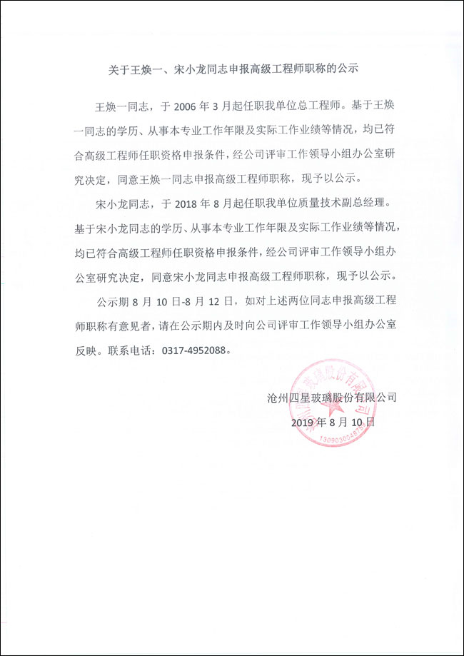 關(guān)于王煥一、宋小龍同志申報(bào)高級工程師職稱的公示