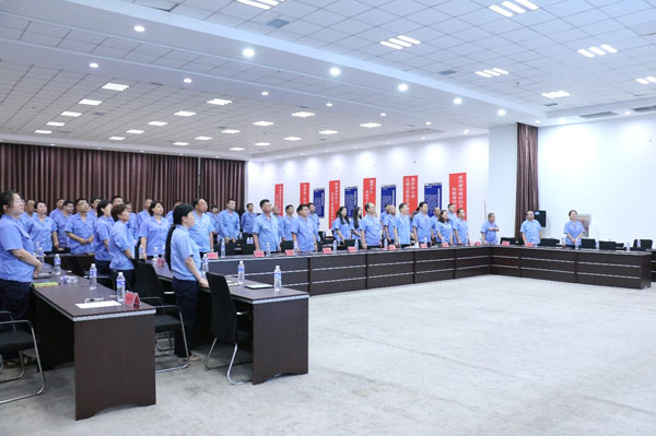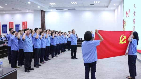(黨支部書記、董事長王煥一領誓) “起來,不愿做奴隸的人們……”在嘹亮而莊嚴的國歌聲中,大會正式開始!拔抑驹讣尤胫袊伯a(chǎn)黨,擁護黨的綱領,遵守黨的章程……”在公司黨支部書記、董事長王煥一領誓下,全體黨員重溫入黨誓詞,堅定有力的聲音響徹全場。